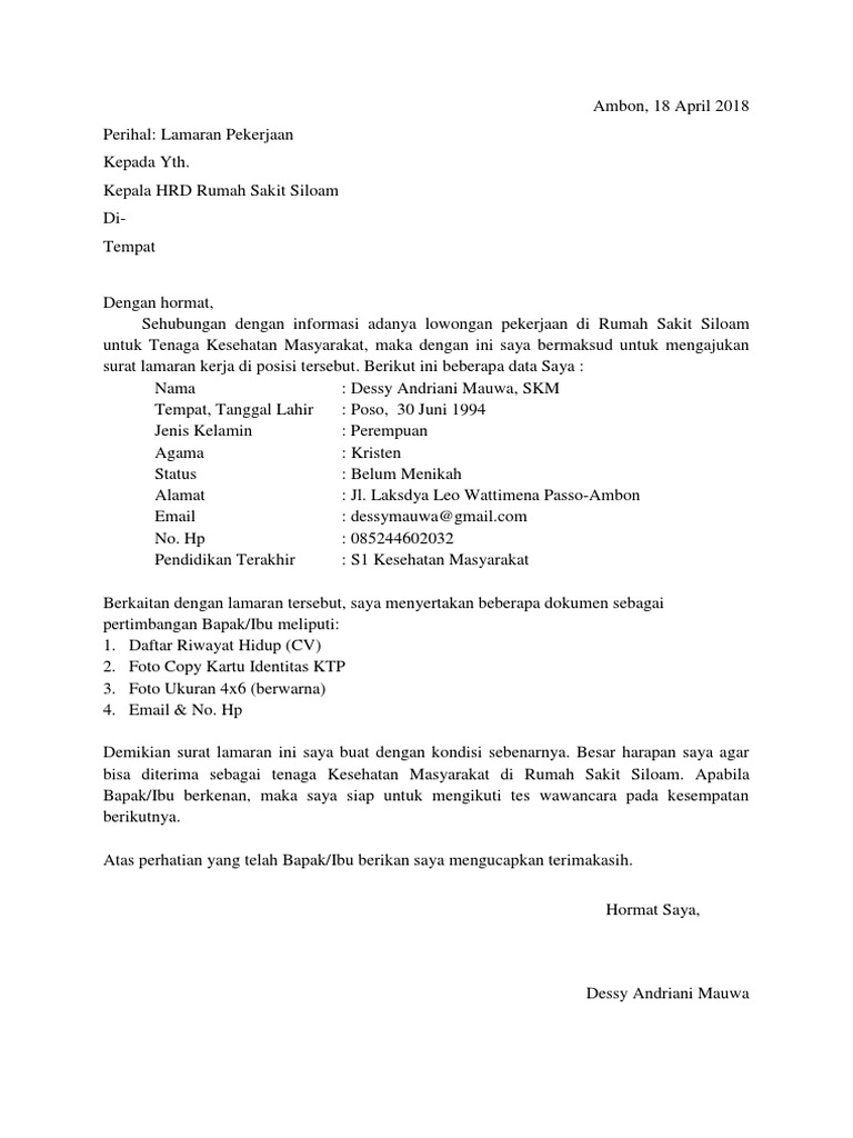 Bapak/ibu hrd rs siloam yogyakarta jl. Apalagi bila anda sudah berkeluarga dan anda adalah seorang suami. Surat lamaran kerja diatas juga. Sebelum ke pembahasan utama mengenai contoh surat lamaran kerja, sebaiknya kita ketahui terlebih dahulu format, cara, dan tips dalam berikut adalah beberapa contoh surat lamaran kerja yang ditunjukkan untuk beberapa perusahaan, seperti pt, bank, indomart, dan lain sebagainya. Untuk menghidupi keluarga anda, memenuhi kebutuhan istri, kebutuhan dan biaya sekolah. Contoh surat lamaran kerja di rumah sakit bagian pendaftaran. Kumpulan contoh surat lamaran kerja beserta formatnya. Contoh surat lamaran kerja sangat dibutuhkan bagi kamu yang ingin mendapatkan pekerjaan terutama di rumah sakit. Contoh surat lamaran kerja rumah sakit siloam & sardjito. Dan saya akan bekerja dengan serius, baik dalam satu tim ataupun perseorangan, sehingga dapat mempertahankan dan meningkatkan kualitas pelayanan di rumah sakit ini. Surat lamaran kerja di rumah sakit. Contoh surat keluar dari rumah sakit. Contoh surat lamaran kerja menjadi guru.